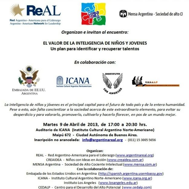 Evento REAL: Martes 9 de Abril de 2013, de 17:00 a 20:30 hrs. Auditorio de ICANA (Instituto Cultural Argentino Norte-Americano) Maipú 672 – Ciudad Autónoma de Buenos Aires, Argentina Inscripción no arancelada: info@argentinareal.org – (011) 15 3005 5656 La inteligencia de niños y jóvenes es el principal capital para el futuro de todo país y…