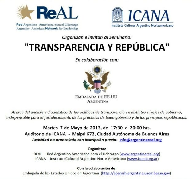 REAL evento: “TRANSPARENCIA Y REPÚBLICA” Martes 7 de Mayo de 2013, de 17:30 a 20:00 hrs. Auditorio de ICANA – Maipú 672, Buenos Aires, Argentina Actividad no arancelada con inscripción previa: info@argentinareal.org Acerca del análisis y diagnóstico de las políticas de transparencia en distintos niveles de gobierno, indispensable para el fortalecimiento de las prácticas de…